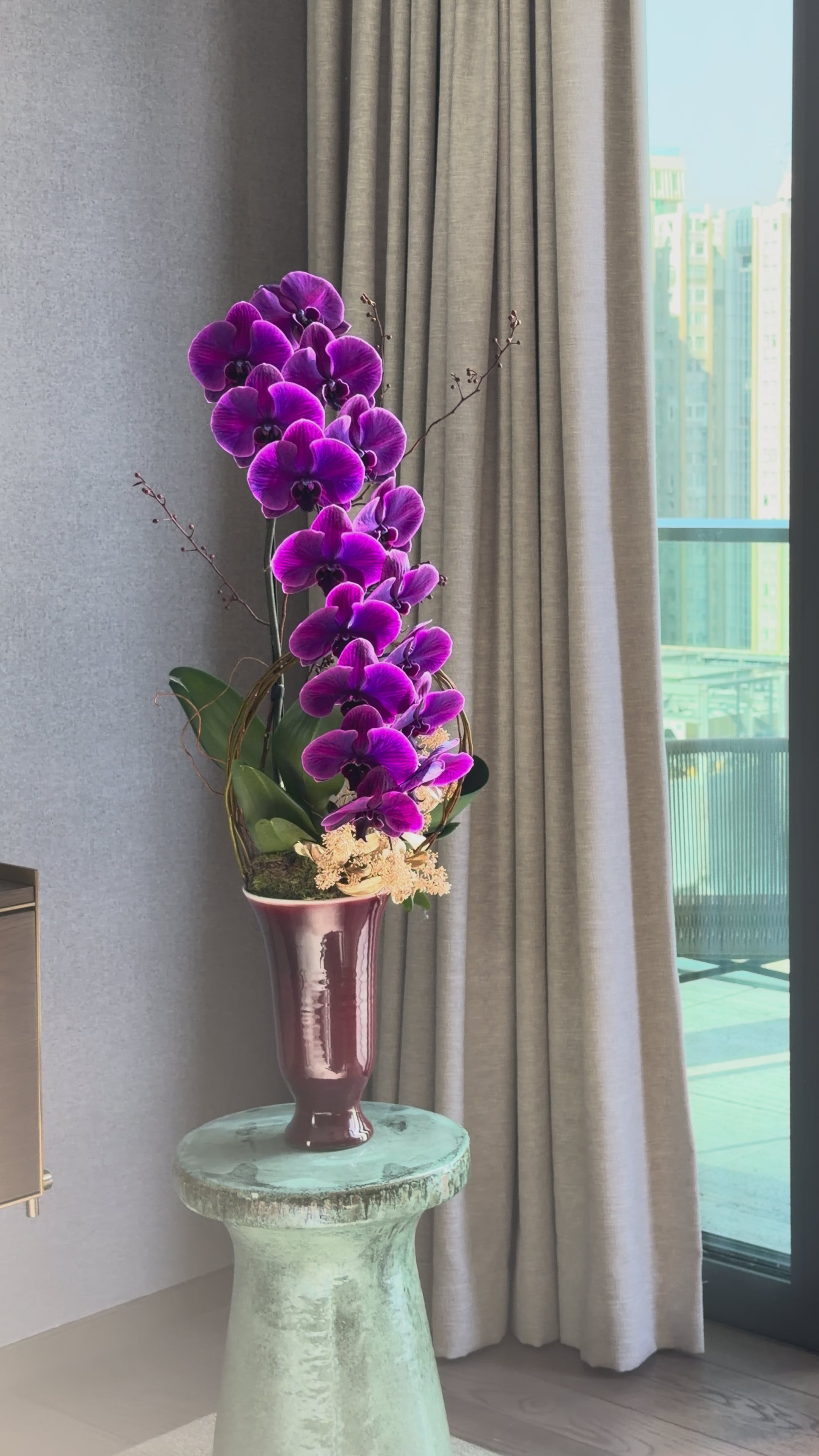 Refined elegance meets auspicious symbolism for the Year of the Horse. This sophisticated composition celebrates upward momentum through restraint—a single, spectacular stem of deep purple phalaenopsis orchid rises with commanding vertical presence. Each bloom displays rich magenta tones that deepen toward the center, embodying ambition, prosperity, and distinguished achievement.