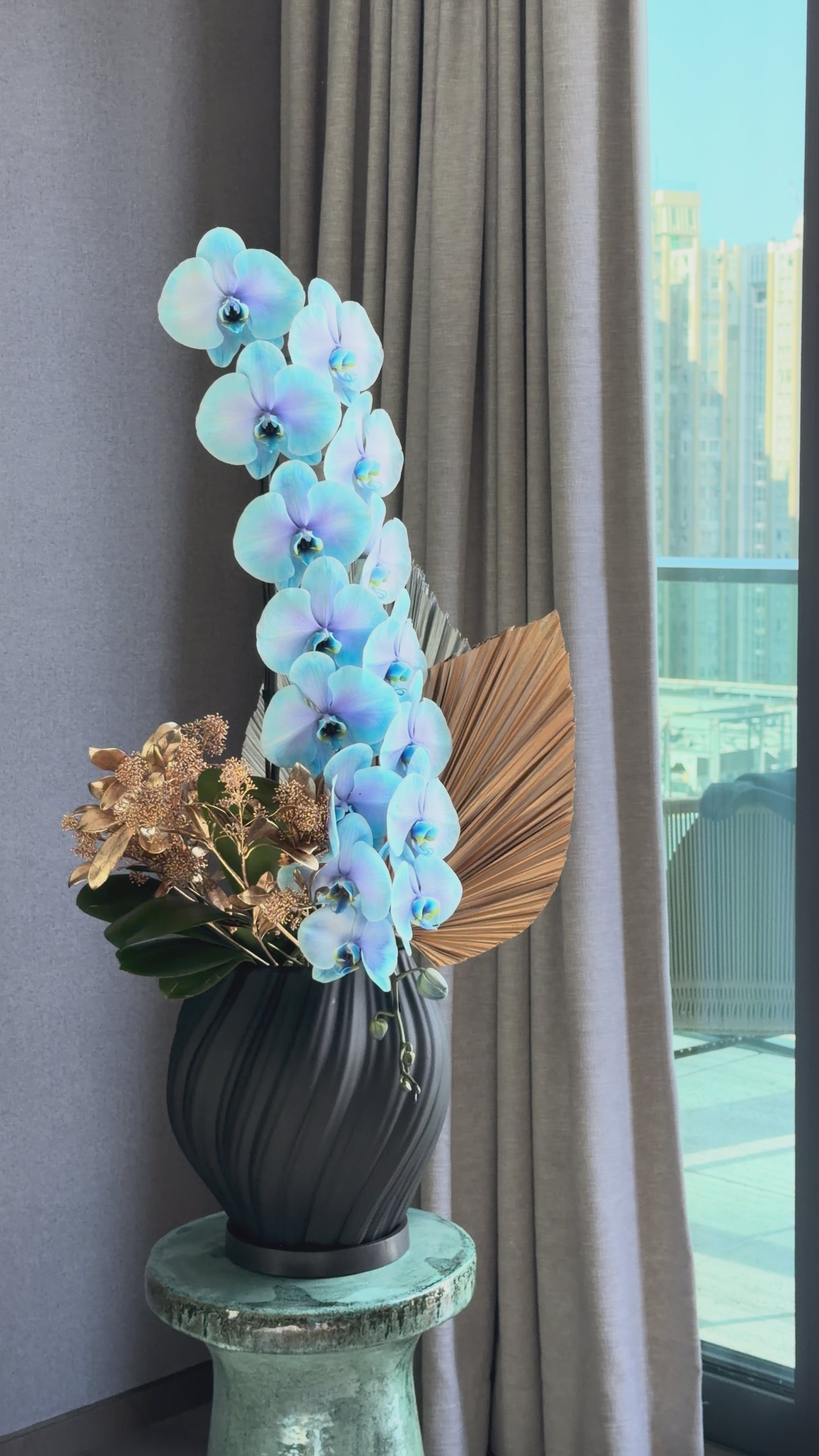 The matte black sculptural vase provides elegant contrast, allowing the orchid's celestial coloring to take center stage. In Chinese tradition, distinctive blooms signal that exceptional opportunities are approaching. Ideal for those who appreciate rarity, refinement, and the understanding that true luxury lies in the extraordinary.
