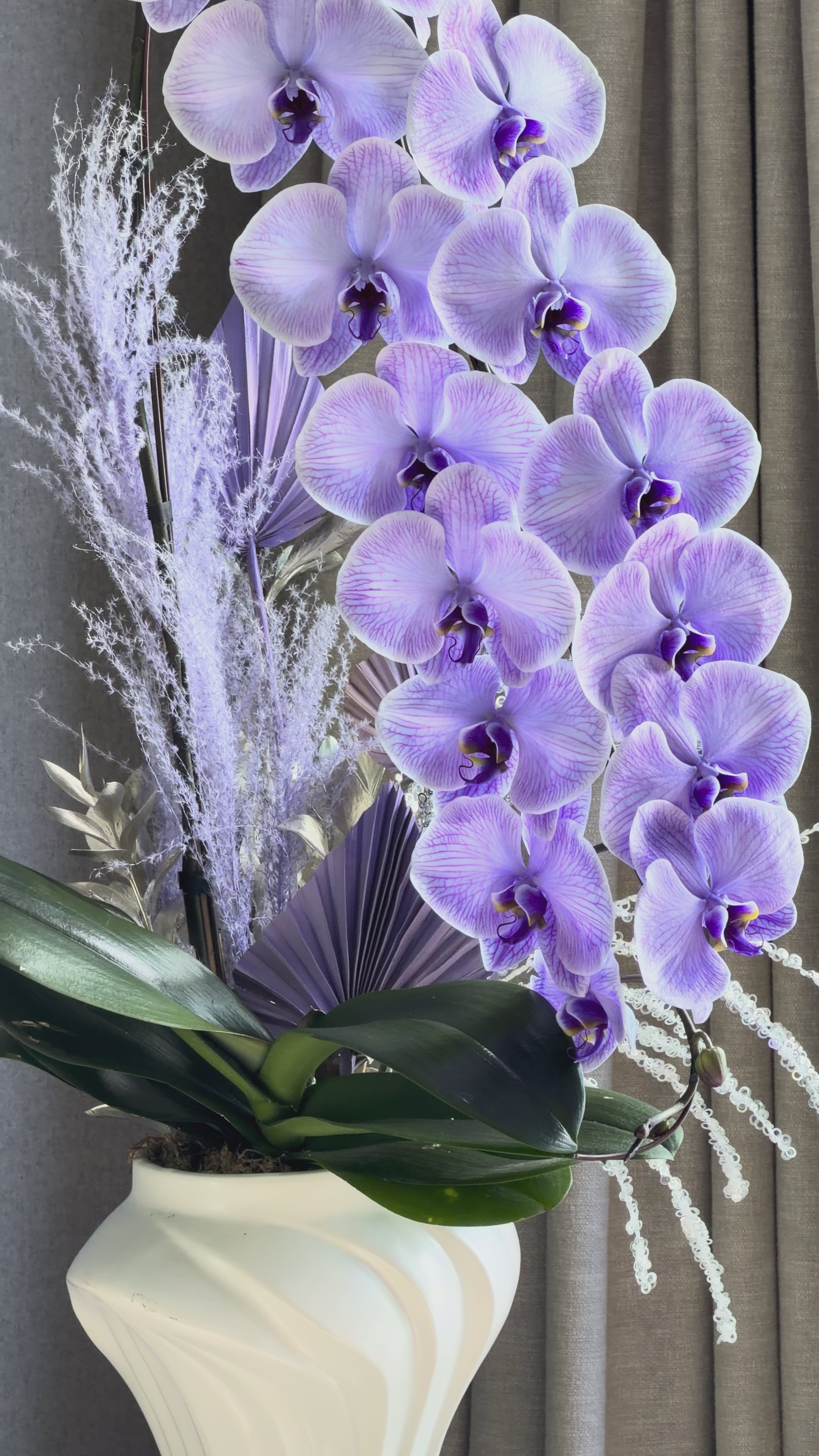 Gentle Prosperity celebrates refined wealth through an elegant single lavender phalaenopsis orchid. In Chinese tradition, purple symbolizes nobility and fortune, while the soft lilac tones convey grace and dignity.