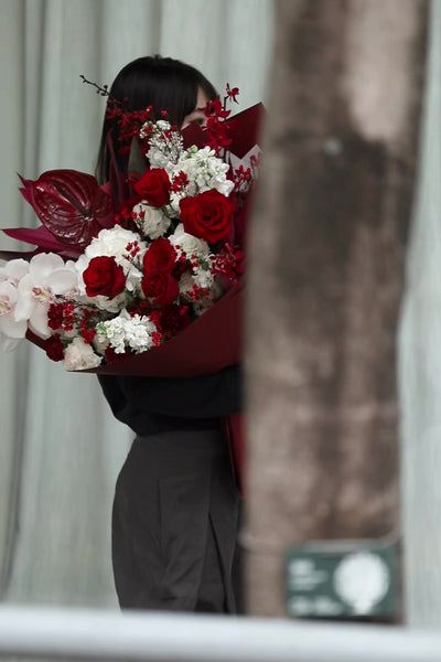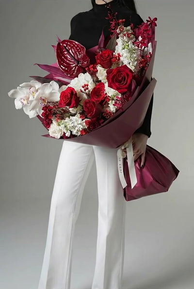 Elevate the art of gifting with the Royal Crimson, a breathtaking arrangement designed for moments that demand grandeur. This exquisite bouquet features a dramatic interplay between the velvet intensity of deep red roses and the sculptural elegance of pristine white Cymbidium orchids. Accented with dark, exotic Anthuriums and lush seasonal textures, it is wrapped in a sophisticated crimson embrace that radiates modern luxury.